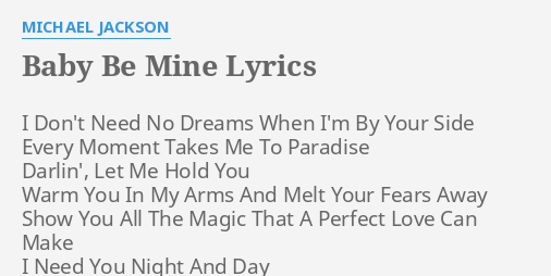 I Dont Need No Dreams When Im By Your Side Every Moment Takes Me To Paradise Darlin Let Me Hold You Warm You In My Arms And Me. Lyrics to Baby Be Mine by MICHAEL JACKSON. I dont need no dreams when Im by your side Every moment takes me to paradise Darlin let me hold you Warm you in my arms and melt your f. Lyrics to Baby Be Mine by Michael Jackson from the Thriller 25th Anniversary Edition Bonus Track album - including song video artist biography translations and more. 1st Verse I Dont Need No Dreams When Im By Your Side Every Moment Takes Me To Paradise Darlin Let Me Hold You Warm You In My Arms And Melt Your Fears Away Show You All The Magic That A Perfect Love Can Make I Need You Night And Day Chorus 1 So. I DO NOT OWN ANYTHING. Refrén 1 So Baby Be Mine Baby You Gotta Be Mine And Girl Ill Give You All I Got To Give So Bab.